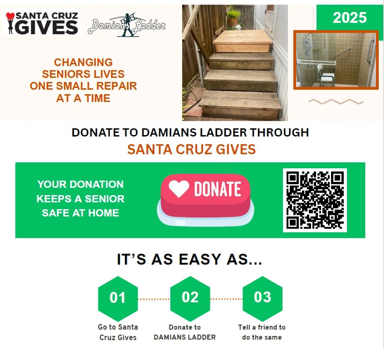 Seniors and people with disabilities, living on limited incomes, may not be able to afford small repairs and updates to their homes. Damians Ladder is a nonprofit organization that provides small home repairs at low or no-cost, depending on the client’s needs. We enable seniors and people with disabilities to stay in their homes and enjoy a good quality of life.